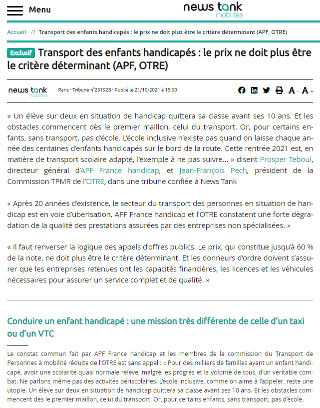 L’OTRE et APF-France handicap signe une tribune commune – NewsTank Mobilités / Article de presse, MyMobility dans les médias, Tribune / Par MyMobility Notre président Jean-François Pech co-signe une tribune appelant à un engagement du gouvernement pour ne laisser aucun enfant handicapé au bord de la route. Lire la tribune dans son intégralité Articles à découvrir : Seine-et-Marne : un partenariat pour aider aux déplacements des personnes handicapées – L’Actu.fr 2024-03-15 | Article de presse, MyMobility dans les médias Le transport scolaire des élèves en situation de handicap revient à JL INTERNATIONAL – Echomag 2020-01-03 | Article de presse, MyMobility dans les médias MyMobility remporte le marché de services de mobilité à la demande de l’Oise – Mobilités magazine 2022-06-19 | Article de presse, MyMobility dans les médias 2020, l’an 1 du WLTP – L’Equipe 2020-06-11 | Article de presse, MyMobility dans les médias
